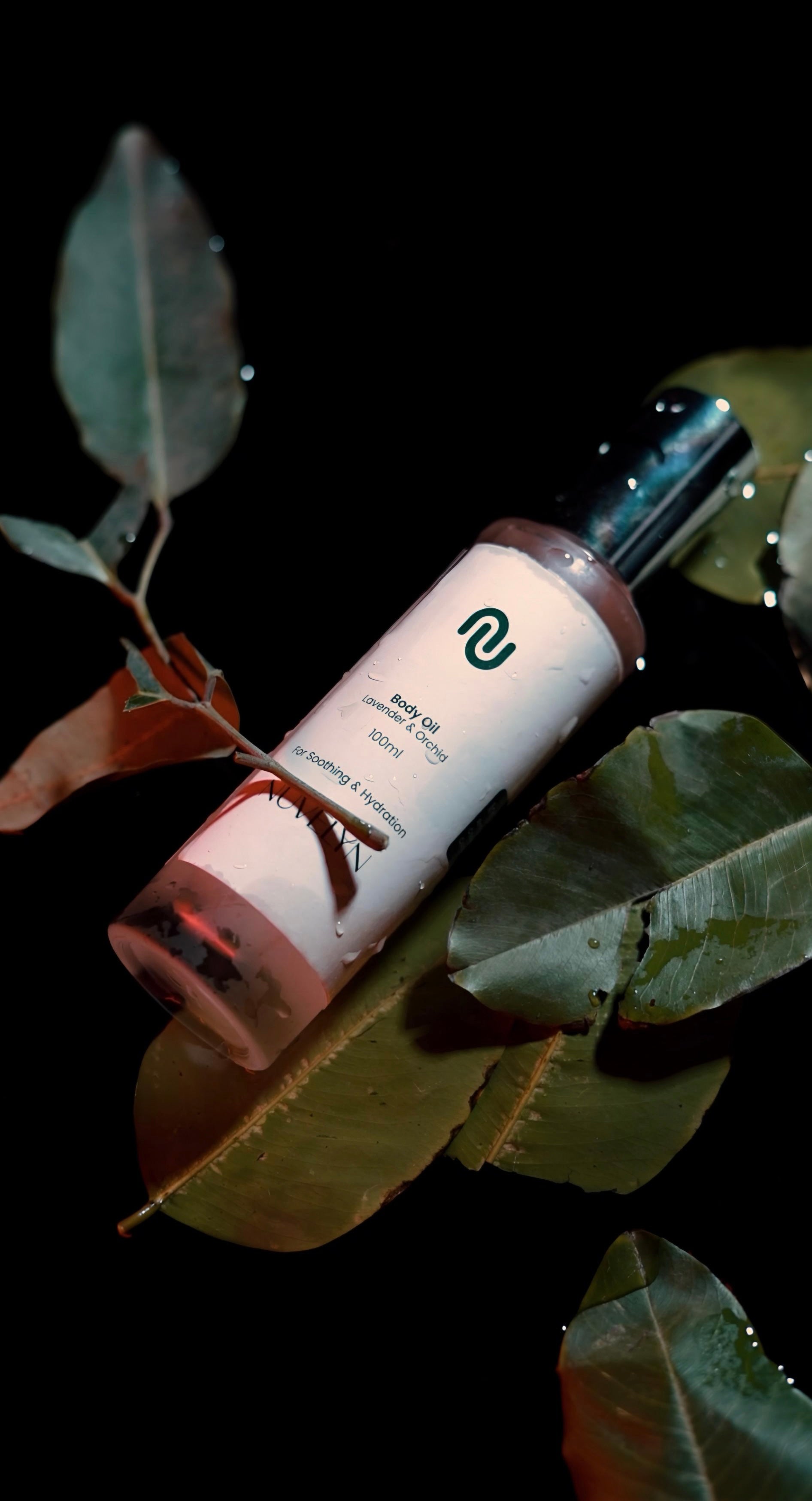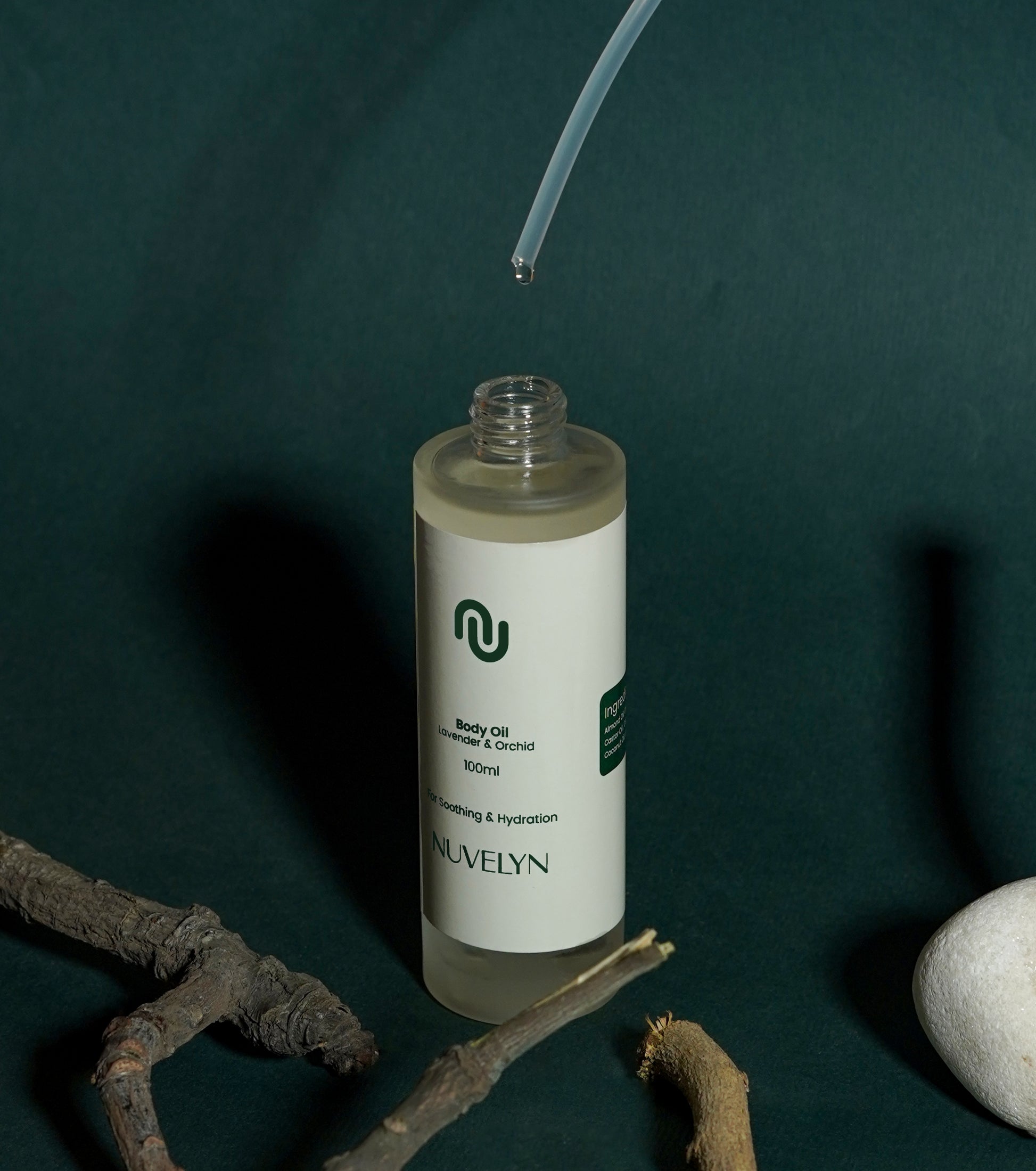 Dispense a small amount of Nuvelyn quick-absorbing body oil.